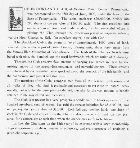Founded in 1899, the Brookland Club is the longest, continuously operating hunting and fishing club in Pennsylvania. Original member of the club were mostly aristocrats of Couldsport, Galton and Wellsboro who traveled by horseback to set up tents on the club property along Telescope Road. The original superintendent house for the club caretaker was located at the current address of 691 Telescope. Eventually members became tired of setting up tents so they set up more permanent structures, hence where the camps come from. Club created membership on land to help with taxes on these structures. Allowed for members to live and build on the property if they continued membership with the club. The original charter also encouraged these properties and camps to be handed down from generation to generation as well as membership to the club. Original annual club dues were 10 dollars. Below is an update on the club along with some pictures dated 1914.